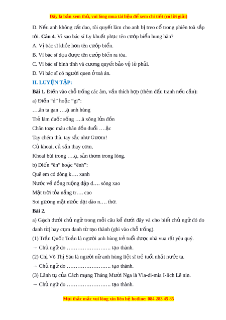 C. Vì bác sĩ bình tĩnh và cư ng ơ quy t ế b o ả v l ệ ph ẽ i ả . D. Vì bác sĩ có ngư i ờ quen t ở oà án. II. LUYỆN T P Ậ : Bài 1. Đi n vào ề chỗ trống các âm, v n t ầ hích h p ( ợ thêm đ u t ấ ranh n u c ế n) ầ : a) Đi n “d” ho ề c ặ “gi”: