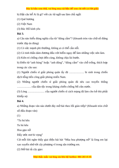 ệ đ xe ể m chi ti t ế (có l i ờ gi i ả ) b) Đ t ặ câu k ể Ai là gì? v i ớ các từ ng s ữ au làm chủ ng : ữ (1) Quê hư ng ơ (2) Việt Nam (3) Bác Hồ kính yêu Bài 3. a) Câu nào hi u đúng nghĩ ể a c a ủ t “dũng c ừ m
