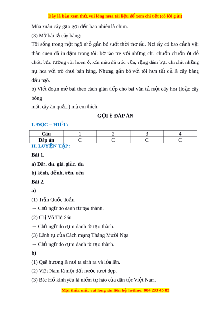ạ mở bài theo cách gián ti p ế cho bài văn t ả m t ộ cây hoa (lo c ặ cây bóng mát, cây ăn qu ...) ả mà em thích. G I Ợ Ý ĐÁP ÁN I. Đ C Ọ – HIỂU: Câu 1 2 3 4 Đáp án C C C C II. LUYỆN T P Ậ : Bài 1. a) Dân, d , ạ già, gi c, ặ dạ