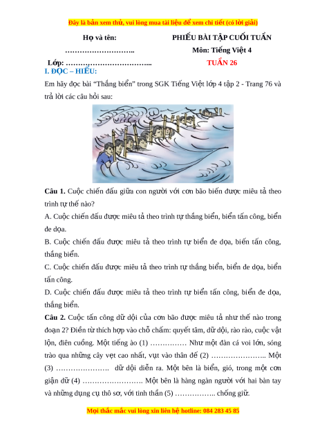 ớ ……………………………... TUẦN 26 I. Đ C Ọ – HIỂU: Em hãy đ c ọ bài “Th ng ắ bi n” ể trong SGK Ti ng ế Vi t ệ l p ớ 4 t p ậ 2 - Trang 76 và trả l i ờ các câu h i ỏ sau: Câu 1. Cu c ộ chi n ế đ u ấ gi a ữ con ngư i ờ v i ớ c n ơ bão bi n ế đư c ợ miêu tả theo trình t t ự h nào? ế A. Cu c ộ chi n đ ế ấu đư c m ợ iêu tả theo trình t t ự h ng ắ bi n, bi ể n t ể n công, bi ấ n ể đe d a. ọ B. Cuộc chi n ế đ u ấ đư c