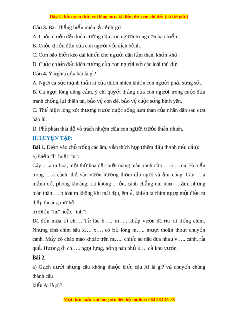 Câu 4. Ý nghĩa c a bài ủ là gì? A. Ng i ợ ca s c m ứ nh ạ th n kì ầ c a ủ thiên nhiên khi n con ng ế ư i ờ ph i ả s ng ử s t ố . B. Ca ng i ợ lòng dũng c m ả , ý chí quy t ế th ng ắ c a ủ con ngư i ờ trong cu c ộ đ u ấ tranh chống l i ạ thiên tai, b o v ả con đê, b ệ o ả v cu ệ c s ộ ng bì ố nh yên. C. Thể hi n ệ lòng xót thư ng ơ trư c ớ cu c ộ s ng ố l m ầ than c a ủ nhân dân sau c n ơ bão lũ. D. Phê phán thái đ vô t ộ rách nhi m ệ c a con ng ủ ư i ờ trư c ớ thiên nhiên. II. LUYỆN T P Ậ : Bài 1. Đi n vào ề chỗ trống các âm, v n t ầ hích h p ( ợ thêm d u t ấ hanh n u c ế n ầ ): a) Đi n “l ề " ho c ặ “n”: Cây ….a ra hoa, m t ộ th ứ hoa đ c ặ bi t ệ mang màu xanh c a ủ ….á ….on. Hoa n ẩ