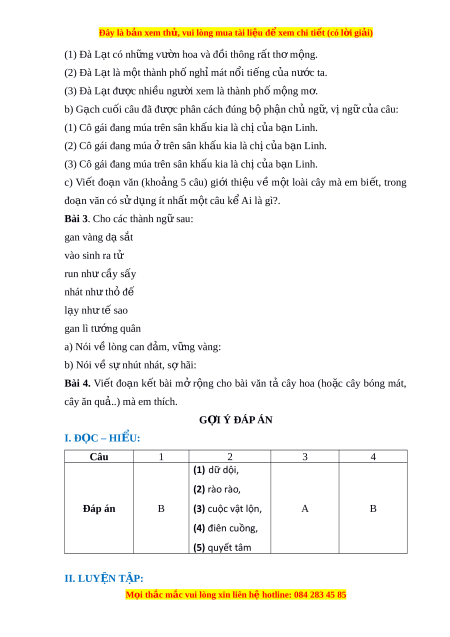 Bài 3. Cho các thành ng s ữ au: gan vàng dạ s t ắ vào sinh ra t ử run như cầy sấy nhát nh t ư h đ ỏ ế l y nh ạ t ư s ế ao gan lì tư ng quân ớ a) Nói v l ề òng can đ m ả , v ng ữ vàng: b) Nói về s nhút ự nhát, sợ hãi: Bài 4. Vi t ế đo n ạ k t ế bài mở r ng ộ cho bài văn t ả cây hoa (ho c ặ cây bóng mát, cây ăn qu ..) ả mà em thích. G I Ợ Ý ĐÁP ÁN I. Đ C Ọ – HIỂU: Câu 1 2 3 4 (1) dư dội, (2) rào rào, Đáp án B