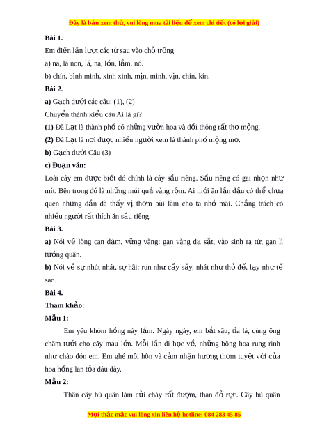 b) Nói về sự nhút nhát, sợ hãi: run như c y ầ s y ấ , nhát nh ư th ỏ đ , ế l y ạ nh ư tế sao. Bài 4. Tham kh o: ả Mẫu 1: Em yêu khóm h ng ồ này l m ắ . Ngày ngày, em b t ắ sâu, t a ỉ lá, cùng ông chăm tư i ớ cho cây mau l n. ớ M i ỗ l n ầ đi h c ọ v , ề nh ng ữ bông hoa rung rinh