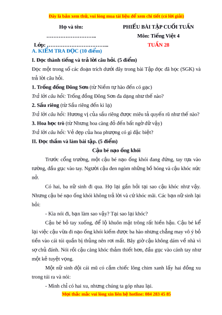 ớ ……………………………... TUẦN 28 A. KIỂM TRA Đ C Ọ (10 đi m ể ) I. Đ c ọ thành ti ng và t ế r l ả i ờ câu h i ỏ . (5 đi m ể ) Đ c ọ m t ộ trong số các đo n ạ trích dư i ớ đây trong bài T p ậ đ c ọ đã h c ọ (SGK) và trả l i ờ câu h i ỏ . 1. Tr ng ố đ ng Đ ồ ông S n ơ (t N ừ i m ề t hào đ ự n có g ế c) ạ Trả l i ờ câu h i
