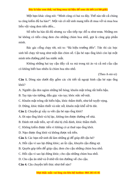 ược ống khói và không đư c t ợ r t ả i n. ề Câu 3. Các b n n ạ s ữ inh đã làm nh ng gì ữ đ gi ể úp đ c ỡ u ậ bé? A. H i ỏ c u ậ vì sao l i ạ đ ng khóc; ứ an i ủ c u, ậ khuyên c u ậ đ ng s ừ . ợ B. Quyên góp ti n đ ề ể giúp c u; ậ đem cho c u nh ậ ng chùm ữ hoa nh . ỏ C. H i ỏ c u vì ậ sao l i ạ đ ng khóc; ứ cho c u nh ậ ng chùm ữ hoa nh . ỏ D. Cho c u ậ ăn nh và ờ nh ở r ờ i ồ tìm đư ng v ờ ề cho c u. ậ