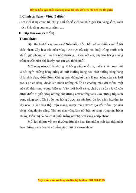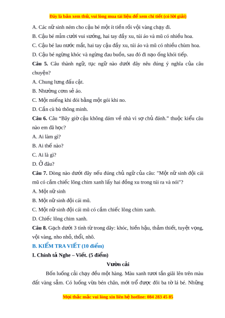 Câu 7. Dòng nào dư i ớ đây n u ế đúng chủ ngữ c a ủ câu: "M t ộ nữ sinh đ i ộ cái mũ có c m ắ chi c ế lông chim xanh l y hai ấ đ ng xu t ồ rong túi ra và nói"? A. M t ộ n s ữ inh B. M t ộ n s ữ inh đ i ộ cái mũ. C. M t ộ n s ữ inh đ i ộ cái mũ có c m ắ chi c l ế ông chim xanh. D. Chi c ế lông chim xanh. Câu 8. G ch ạ dư i ớ 3 tính t ừ trong dãy: khóc, hi n ề h u, ậ th m ả thi t ế , tuy t ệ v ng, ọ v i ộ vàng, nho nh , t ỏ hổi, nhô. B. KIỂM TRA VI T Ế (10 đi m ể ) I. Chính t N ả ghe – Vi t ế . (5 đi m ể ) Vư n c ờ ải Bốn lu ng ố c i ả ch y ạ đ u ề m t ộ hàng. Màu xanh tư i ơ t n ắ giãi lên trên màu đ t ấ vàng s m ẫ . Có lu ng ố v a ừ bén chân, m i ớ trổ đư c