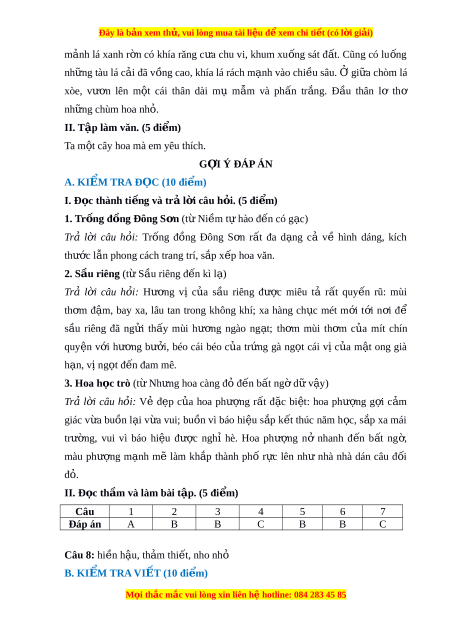 ầ và làm bài t p. ( ậ 5 đi m ể ) Câu 1 2 3 4 5 6 7 Đáp án A B B C B B C Câu 8: hi n h ề u, ậ th m ả thi t ế , nho nhỏ B. KIỂM TRA VI T Ế (10 đi m ể ) M i