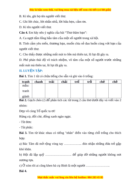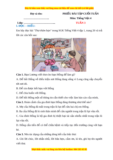 ọ bài "Thư thăm b n ạ " trong SGK Ti ng ế Vi t ệ 4 t p ậ 1, trang 26 và trả l i ờ các câu h i ỏ sau: Câu 1. B n ạ Lư ng ơ vi t ế th cho b ư n H ạ ng đ ồ l ể àm gì? A. Để h i ỏ H ng ồ về đi u ề ki n ệ n i ơ H ng ồ đang s ng ố vì Long cũng s p ắ chuy n ể t i ớ n i ơ đó. B. Đ xi ể n đư c ợ k t ế b n ạ v i ớ H ng ồ C. Đ chi ể a buồn v i ớ Hồng. D. Đ h ể i ỏ Hồng m t ộ số thông tin c n t ầ hi t ế cho vi c l ệ àm báo cáo c a ủ mình, Câu 2. Hoàn c nh ả c a gi ủ a đình b n ạ H ng đáng ồ thư ng nh ơ t ư h nào? ế A. Mẹ c a ủ Hồng đã m t ấ trong tr n ậ lũ l t ụ đ c ể u hai ứ ch em ị H ng. ồ B. Ba c a H ủ