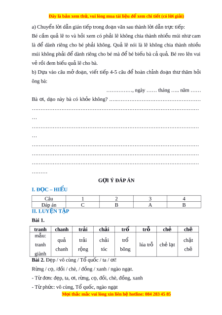 …………………………………………………………………………………… ……… G I Ợ Ý ĐÁP ÁN I. Đ C Ọ – HIỂU Câu 1 2 3 4 Đáp án C B A B II. LUYỆN T P Ậ Bài 1. tranh chanh trải ch i ả trổ trỗ chẻ chẽ mẫu: quả tr i ả ch i ả trổ ch t ặ tranh lúa trỗ chẻ l t ạ chanh r ng ộ tóc bông chẽ giành