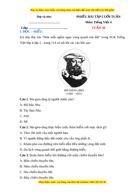 Câu 1. Ma-gien-lăng là ngư i ờ nư c ớ nào? A. Bồ Đào Nha B. Tây Ban Nha C. Anh D. Mĩ