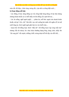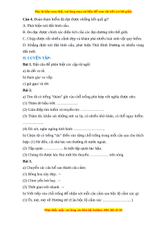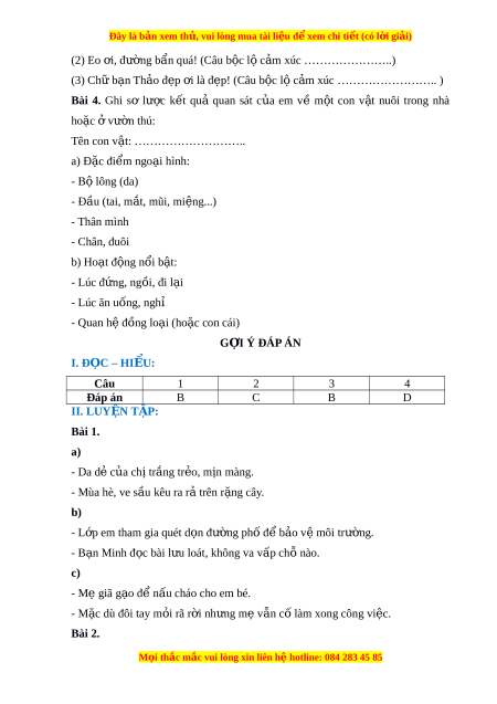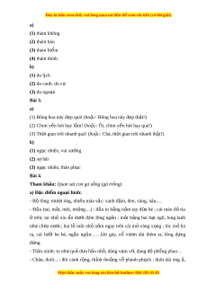 ậ : ……………………….. a) Đ c đi ặ m ể ngo i ạ hình: - B l ộ ông (da) - Đầu (tai, m t ắ , mũi, mi ng... ệ ) - Thân mình - Chân, đuôi b) Ho t ạ đ ng n ộ i ổ b t ậ : - Lúc đ ng, ng ứ ồi, đi l i ạ - Lúc ăn uống, nghỉ - Quan hệ đồng lo i ạ (ho c ặ con cái) G I Ợ Ý ĐÁP ÁN I. Đ C Ọ – HIỂU: Câu 1 2 3 4 Đáp án B C B D II. LUYỆN T P Ậ : Bài 1. a) - Da dẻ c a ủ ch t ị r ng ắ tr o, m ẻ n ị màng.