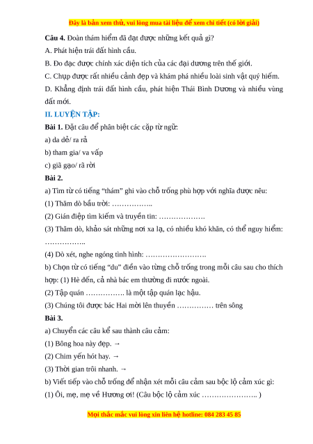 Câu 4. Đoàn thám hi m ể đã đ t ạ đư c nh ợ ng k ữ t ế qu gì ả ? A. Phát hi n t ệ rái đ t ấ hình c u. ầ B. Đo đ c ạ đư c ợ chính xác di n t ệ ích c a các ủ đ i ạ dư ng ơ trên th gi ế i ớ . C. Ch p ụ đư c r ợ t ấ nhi u c ề nh đ ả p và khám ẹ phá nhi u l ề oài sinh v t ậ quý hi m ế . D. Kh ng ẳ đ nh ị trái đ t ấ hình c u, ầ phát hi n ệ Thái Bình Dư ng ơ và nhi u ề vùng đ t ấ m i ớ . II. LUYỆN T P Ậ : Bài 1. Đ t ặ câu đ phân bi ể t ệ các c p t ặ ng ừ : ữ a) da d / ẻ ra rả b) tham gia/ va v p ấ c) giã g o/ ạ rã r i ờ Bài 2. a) Tìm t có ừ ti ng ế “thám” ghi vào ch t ỗ r ng phù h ố p v ợ i ớ nghĩa đư c nêu: ợ (1) Thăm dò b u t ầ r i ờ : …………….. (2) Gián đi p t ệ ìm ki m ế và truy n t ề in: ………………. (3) Thăm dò, kh o ả sát nh ng ữ n i ơ xa l , ạ có nhi u ề khó khăn, có th ể nguy hi m ể : ……………..