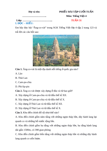 ọ bài “Ăng-co-vát” trong SGK Ti ng ế Vi t ệ l p ớ 4 t p ậ 2 trang 123 và trả l i ờ các câu h i ỏ sau:
