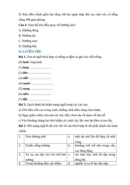 ờ cao trong xanh, nh ng cánh di ữ u đang ề chao lư n. ợ b) Ngay gi a v ữ ư n, t ờ rên tán cây mít, b y chi ẫ m sâu r nhau v ủ l ề àm t . ổ c) Vào kho ng ả tháng hai trên kh p các ắ cành cây, l c ộ non l i ạ đâm ra tua t a. ủ Bài 3. Nối tr ng ạ ngữ c ở t ộ trái v i ớ v ế câu thích h p ợ c ở t ộ ph i ả thành câu hoàn chỉnh: 1. Trên đư ng ờ phố a. m t ặ t i ạ nhô lên đỏ ng ử cả m t ộ vùng. 2. Trư c ớ cổng trư ng ờ b. kho ng ả tr i ờ trở nên trong v t ắ , cao lồng l ng. ộ 3.