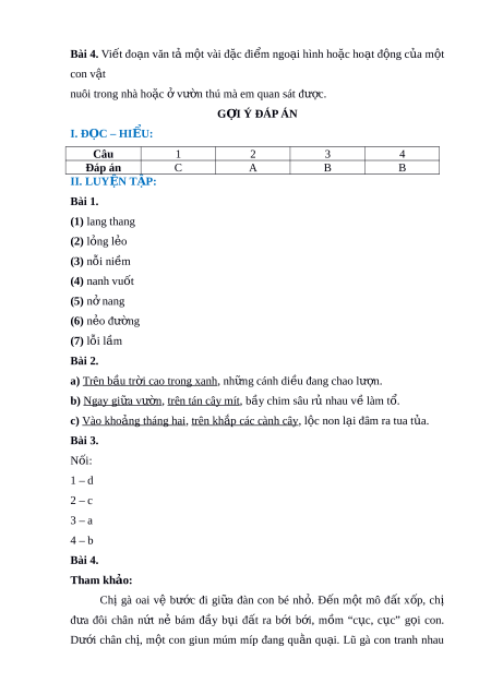 ờ , trên tán cây mít, bầy chim sâu r nhau ủ v l ề àm t . ổ c) Vào kho ng ả tháng hai, trên kh p ắ các cành cây, l c ộ non l i ạ đâm ra tua t a. ủ Bài 3. N i ố : 1 – d 2 – c 3 – a 4 – b Bài 4. Tham kh o: ả Chị gà oai vệ bư c ớ đi gi a ữ đàn con bé nh . ỏ Đ n ế m t ộ mô đ t ấ x p, ố chị đ a ư đôi chân n t ứ nẻ bám đầy b i ụ đ t ấ ra b i ớ b i ớ , mồm “c c, ụ c c” ụ g i ọ con. Dư i ớ chân chị, m t