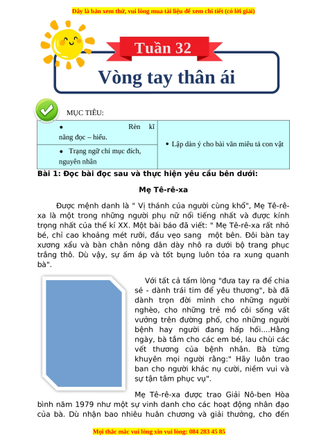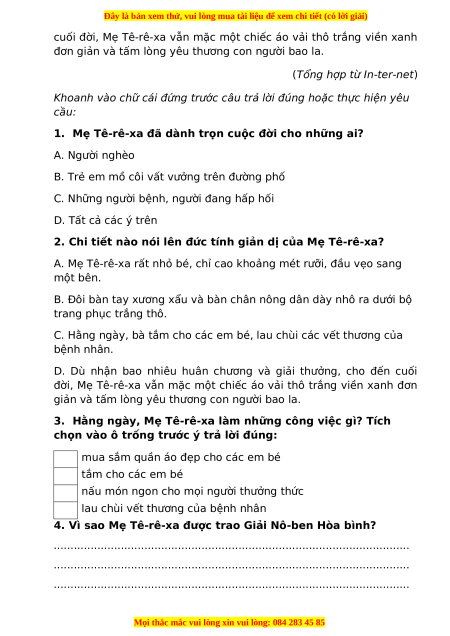 Bài 1: Đọc bài đọc sau và thực hiện yêu cầu bên dưới: Mẹ Tê-rê-xa
