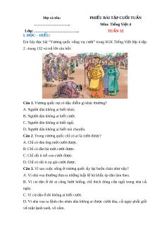 ớ ……………………………... TUẦN 32 I. Đ C Ọ – HIỂU: Em hãy đ c ọ bài “Vư ng ơ qu c ố v ng ắ v ụ cư i ờ ” trong SGK Ti ng ế Vi t ệ l p ớ 4 t p ậ 2 –trang 132 và trả l i ờ câu h i ỏ : Câu 1. Vư ng ơ quốc n có đ ọ c ặ đi m ể gì khác thư ng? ờ A. Ngư i ờ dân không ai bi t ế khóc. B. Ngư i ờ dân không ai bi t ế cư i ờ . C. Ngư i ờ dân không ai bi t ế ng . ủ D. Ngư i ờ dân không ai bi t ế nói chuy n. ệ Câu 2. Trong vư ng
