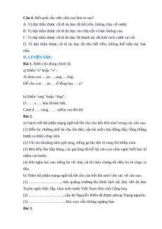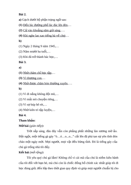 (1) Ngày 2 tháng 9 năm 1945,… (2) Năm mư i ờ ba tuổi,… (3) Khi đã tr t ở hành bác h c,… ọ Bài 3. a) (1) N h chăm ờ chỉ h c ọ t p ậ ,… (3) V ì thư ng ơ con ,… (4) Nh đ ờ ư c ợ chăm bón thư ng xuyên ờ ,…. b) (1) Vì đi n ng ắ không đ i ộ mũ,… (2) Vì m i ả nói chuy n ệ riêng,… (3) Vì s búp bê ợ rét,… (4) Nh ki ờ ên trì t p ậ luyện,… Bài 4. Tham kh o: ả M bài ở (gián ti p ế ): Tr i ờ s p