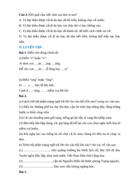 ọ đã thành tài, đã bi t ế cách cư i ờ vui v . ẻ D. Vị đ i ạ th n ầ đư c ợ cử đi du h c ọ đã tiêu h t ế ti n, ề không thể ti p ế t c ụ h c ọ n a. ữ II. LUYỆN T P Ậ : Bài 1. Đi n cho ề đúng chính t : ả a) Đi n “s ề ” ho c “x”: ặ