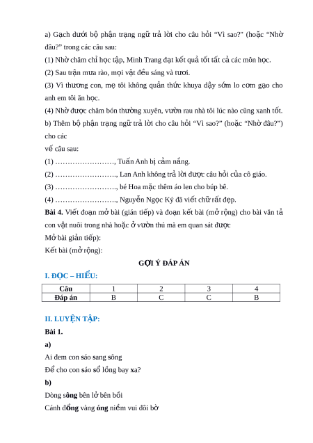ờ hú mà em quan sát đư c ợ Mở bài gi n t ả i p) ế : K t ế bài (m r ở ng ộ ): G I Ợ Ý ĐÁP ÁN I. Đ C Ọ – HIỂU: Câu 1 2 3 4 Đáp án B C C B II. LUYỆN T P Ậ : Bài 1. a)
