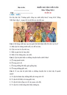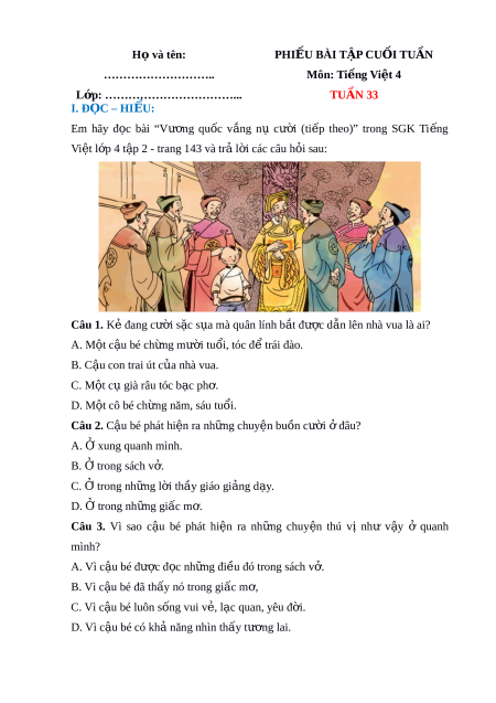 ớ ……………………………... TUẦN 33 I. Đ C Ọ – HIỂU: Em hãy đ c ọ bài “Vư ng ơ qu c ố v ng ắ nụ cư i ờ (ti p ế theo)” trong SGK Ti ng ế Việt l p 4 t ớ p ậ 2 - trang 143 và tr l ả i ờ các câu h i ỏ sau: