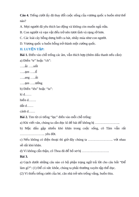 Câu 1. Kẻ đang cư i ờ s c ặ s a m ụ à quân lính b t ắ đư c d ợ n l ẫ ên nhà vua là ai? A. M t ộ c u bé ch ậ ng ừ mư i ờ tu i ổ , tóc đ t ể rái đào. B. C u con t ậ rai út c a nhà vua. ủ C. M t ộ c gi ụ à râu tóc b c ạ ph . ơ D. M t ộ cô bé ch ng năm ừ , sáu tu i ổ . Câu 2. C u ậ bé phát hi n r ệ a nh ng ữ chuy n bu ệ n c ồ ư i ờ đâu? ở A. Ở xung quanh mình. B. Ở trong sách v . ở C. Ở trong nh ng ữ l i ờ th y gi ầ áo gi ng ả d y ạ . D. Ở trong nh ng gi ữ c m ấ . ơ Câu 3. Vì sao c u ậ bé phát hi n ệ ra nh ng ữ chuy n ệ thú vị như v y ậ ở quanh mình? A. Vì c u bé đ ậ ư c ợ đ c nh ọ ng đi ữ u đó t ề rong sách v . ở B. Vì c u bé ậ đã th y nó t ấ rong gi c m ấ , ơ C. Vì c u bé ậ luôn sống vui v , l ẻ c ạ quan, yêu đ i ờ . D. Vì c u bé có kh ậ ả năng nhìn th y t ấ ư ng l ơ ai. Câu 4. Ti ng ế cư i ờ y ấ đã thay đ i ổ cu c ộ s ng ố c a ủ vư ng ơ qu c ố u bu n ồ nh ư thế nào? A. M i ọ ngư i ờ đã yêu thích lao đ ng ộ và không còn mu n ng ố ủ n a. ữ B. Con ngư i ờ và v n ạ v t ậ đ u t ề r nên t ở ư i ơ t nh và r ỉ ng r ạ h ỡ n. ơ C. Các loài cây b ng d ỗ ng bi ư t ế ca hát, nh y m ả úa nh con ng ư ư i ờ . D. Vư ng ơ quốc u buồn bỗng tr t ở hành m t ộ cư ng ờ qu c. ố II. LUYỆN T P Ậ : Bài 1. Đi n vào ề chỗ trống các âm, v n t ẫ hích h p ( ợ thêm d u t ấ hanh n u c ế n ầ ): a) Đi n “t ề r” ho c “ch”: ặ ….. i ả …..uốt ….. m ạ …..ổ …..ang ….. i ả ….. m ạ …..ư ng ở b) Đi n ề “iêu” ho c ặ “iu”: kì d…… hi n d……. ề d t ắ d…… cánh d…… Bài 2. Tim t có t ừ i ng “l ế c” đi ạ n vào ề mỗi ch t ỗ r ng: ố a) Khi vi t ế văn, chúng ta c n đ ầ c kĩ ọ đ bài ề