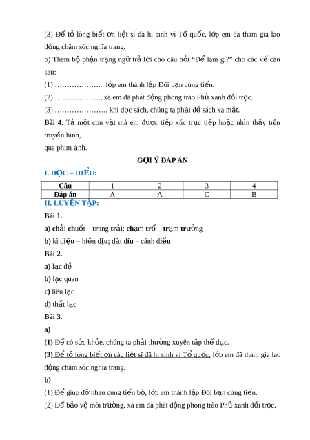 ắ díu – cánh di u ề Bài 2. a) l c ạ đề b) l c ạ quan c) liên l c ạ d) thất l c ạ Bài 3. a) (1) Đ có s ể ức kh e ỏ , chúng ta ph i ả thư ng xuyên t ờ p ậ th d ể c. ụ (3) Đ ể tỏ lòng bi t ế n ơ các li t ệ sĩ đã hi sinh vì T ổ qu c, ố l p ớ em đã tham gia lao đ ng chăm ộ sóc nghĩa trang. b) (1) Đ gi ể úp đ nhau ỡ cùng ti n b ế , l ộ p em ớ thành l p ậ Đôi b n cùng ạ ti n. ế (2) Đ b ể o ả vệ môi trư ng, xã em ờ đã phát đ ng phong t ộ rào Ph xanh đ ủ i ồ tr c. ọ