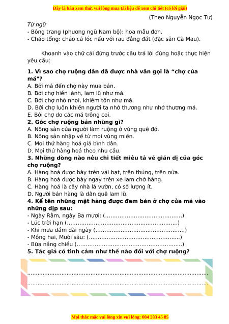 Bài 1: Đọc câu chuyện sau và thực hiện yêu cầu bên dưới: CHỢ CỦA MÁ