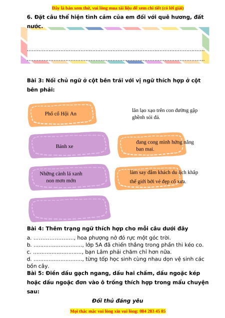 6. Đặt câu thể hiện tình cảm của em đối với quê hương, đất nước.