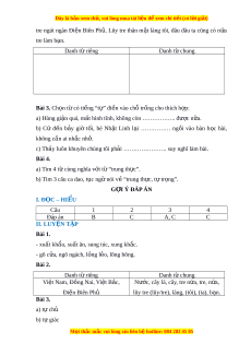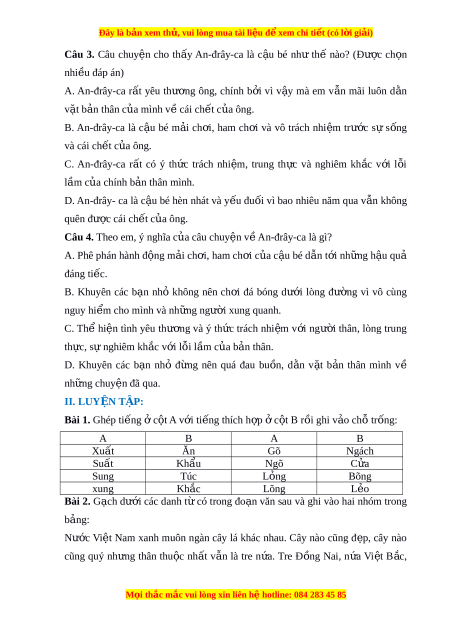 Câu 4. Theo em, ý nghĩa c a ủ câu chuy n v ệ ề An-đrây-ca là gì? A. Phê phán hành đ ng m ộ i ả ch i ơ , ham ch i ơ c a c ủ u ậ bé d n t ẫ i ớ nh ng h ữ u qu ậ ả đáng ti c. ế B. Khuyên các b n ạ nhỏ không nên ch i ơ đá bóng dư i ớ lòng đư ng ờ vì vô cùng nguy hi m ể cho mình và nh ng ng ữ ư i ờ xung quanh. C. Thể hi n ệ tình yêu thư ng ơ và ý th c ứ trách nhi m ệ v i ớ ngư i ờ thân, lòng trung th c, s ự ự nghiêm kh c v ắ i ớ lỗi lầm c a b ủ n ả thân. D. Khuyên các b n ạ nhỏ đ ng ừ nên quá đau bu n, ồ d n ằ v t ặ b n ả thân mình về nh ng chuy ữ ện đã qua. II. LUYỆN T P Ậ : Bài 1. Ghép ti ng ế c ở t ộ A v i ớ ti ng t ế hích h p ợ c ở t ộ B r i ồ ghi v o ả ch t ỗ r ng: ố A B A B Xuất Ăn Gõ Ngách Su t ấ Khẩu Ngõ C a ử Sung Túc L ng ỏ Bõng xung Khắc Lõng Lẻo Bài 2. Gạch dư i ớ các danh t ừ có trong đo n