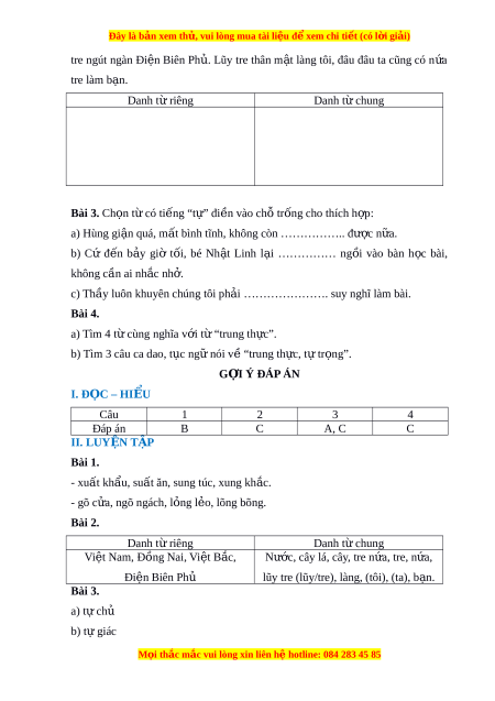 ả …………………. suy nghĩ làm bài. Bài 4. a) Tìm 4 t cùng ừ nghĩa v i ớ t “t ừ rung th c”. ự b) Tìm 3 câu ca dao, t c ng ụ nói ữ về “trung th c, t ự ự tr ng”. ọ G I Ợ Ý ĐÁP ÁN I. Đ C Ọ – HIỂU Câu 1 2 3 4 Đáp án B C A, C C II. LUYỆN T P Ậ Bài 1.