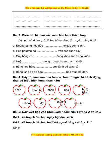 Bài 4: Hãy tô màu vào quả táo có chứa từ ngữ chỉ hành động,
