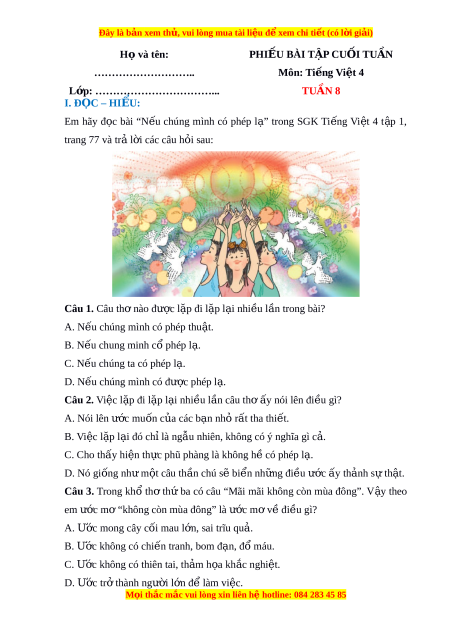 Câu 1. Câu thơ nào đư c l ợ p ặ đi l p l ặ i ạ nhi u l ề n t ầ rong bài? A. N u chúng m ế ình có phép thu t ậ . B. N u chung ế minh cổ phép l . ạ C. N u chúng ế ta có phép l . ạ D. N u chúng m ế ình có đư c ợ phép l . ạ Câu 2. Việc l p đi ặ l p ặ l i ạ nhi u l ề n câu t ầ h ơ y nói ấ lên đi u gì ề ? A. Nói lên ư c ớ mu n c ố a ủ các b n ạ nh r ỏ t ấ tha thi t ế . B. Việc l p ặ l i ạ đó ch l ỉ à ng u nhi ẫ