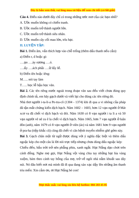 ớ đây chỉ có trong nh ng ữ ư c ớ m c ơ a ủ các b n ạ nh ? ỏ A. c m Ướ uốn không có chi n t ế ranh. B. c Ướ muốn tr t ở hành ngư i ờ l n. ớ C. c Ướ muốn tr t ở hành siêu nhân. D. c m Ướ uốn cây cối mau l n, t ớ rĩu h t ạ . II. LUYỆN T P Ậ : Bài 1. Đi n âm ề , v n t ầ hích h p ợ vào ch t ỗ r ng ( ố thêm d u t ấ hanh n u c ế n) ầ : a) Đi n r ề , d ho c gi ặ : …. n ….ày s ạ ư ng ….ó. ơ ….ấy ….ách ph i ả …. l ữ ấy l . ề b) Đi n ề iên ho c i ặ êng: M….. nói tay làm T….. h c ọ l h ễ u h ậ c ọ văn.