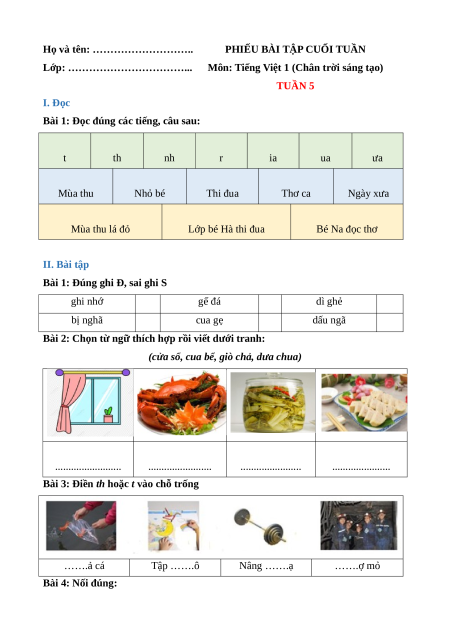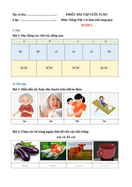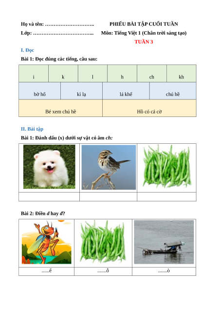 - Tailieugiaovien.com.vn giới thiệu phiếu bài tập cuối tuần môn Tiếng việt lớp 1 bộ Chân trời sáng tạo mới nhất nhằm giúp Giáo viên có thêm tài liệu tham khảo Tiếng việt lớp 1.