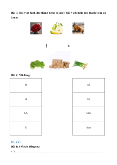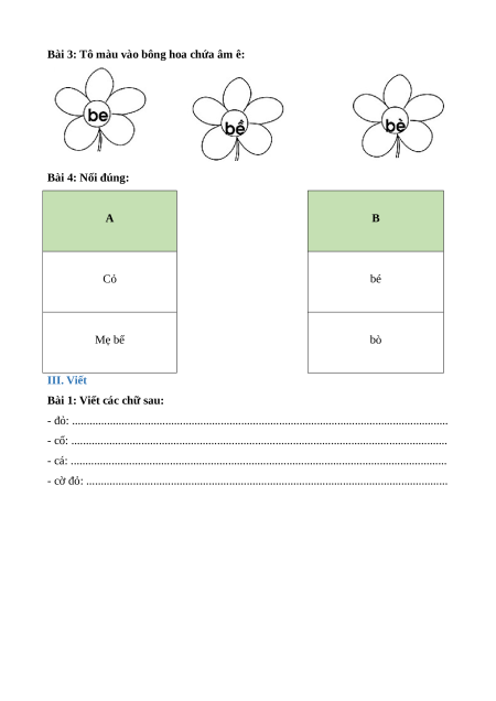 Bài 3: Tô màu vào bông hoa chứa âm ê: Bài 4: Nối đúng: A B Cỏ bé Mẹ bế bò III. Viết