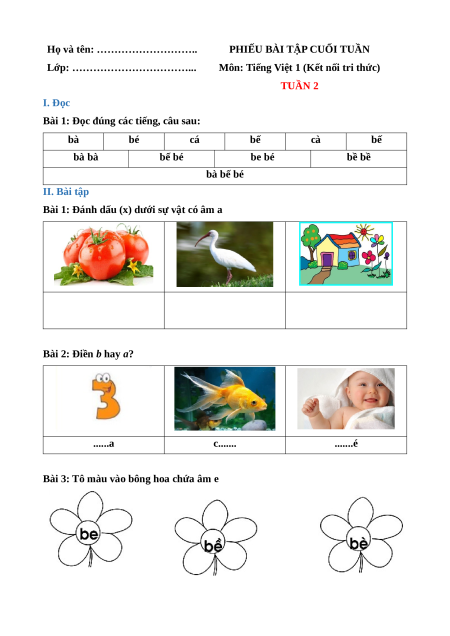 Môn: Tiếng Việt 1 (Kết nối tri thức) TUẦN 2 I. Đọc
