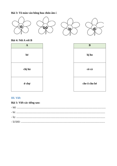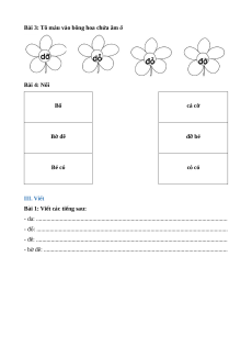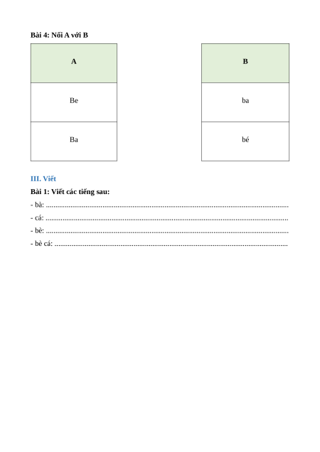Bài 3: Tô màu vào bông hoa chứa âm e Bài 4: Nối A với B A B Be ba Ba bé III. Viết