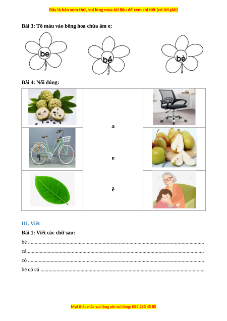 Bài 3: Tô màu vào bông hoa chứa âm e: Bài 4: Nối đúng: a e ê III. Viết