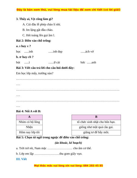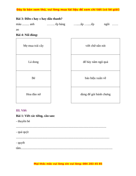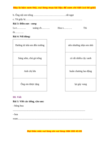 Bài 3: Điền oan - oang Lo t……….. soáng ch………. Hoa x………. Thi th……….. Bài 4: Nối đúng: