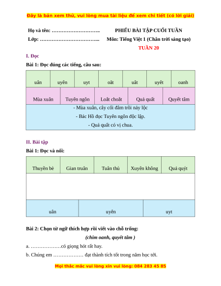 Bài 1: Đọc đúng các tiếng, câu sau: uân uyên uyt oăt uât uyêt oanh Mùa xuân Tuyên ngôn Loắt choắt Quả quất Quyết tâm