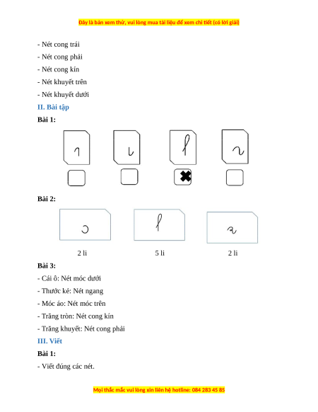 - Nét cong trái - Nét cong phải - Nét cong kín - Nét khuyết trên - Nét khuyết dưới II. Bài tập Bài 1: Bài 2: 2 li 5 li 2 li Bài 3: - Cái ô: Nét móc dưới - Thước kẻ: Nét ngang - Móc áo: Nét móc trên - Trăng tròn: Nét cong kín