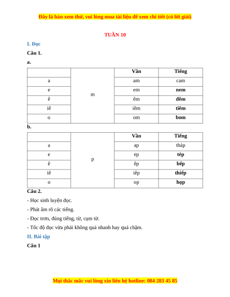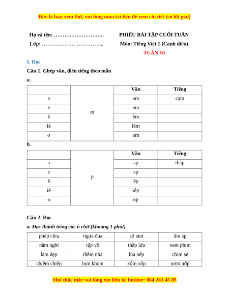 Câu 1. Ghép vần, điền tiếng theo mẫu a. Vần Tiếng a am cam e em m ê êm iê iêm o om b. Vần Tiếng a ap tháp e ep p ê êp iê iêp o op Câu 2. Đọc
