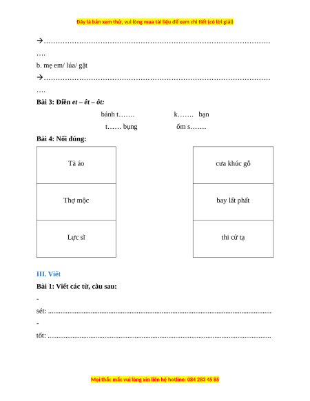 Bài 3: Điền et – êt – ôt: bánh t……. k……. bạn t…… bụng ốm s……. Bài 4: Nối đúng: Tà áo cưa khúc gỗ Thợ mộc bay lất phất Lực sĩ thi cử tạ III. Viết
