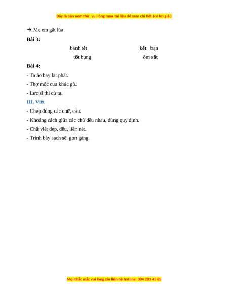 Mẹ em gặt lúa Bài 3: bánh tét kết bạn tốt bụng ốm sốt Bài 4: - Tà áo bay lất phất. - Thợ mộc cưa khúc gỗ. - Lực sĩ thi cử tạ. III. Viết