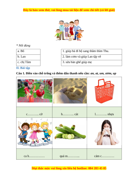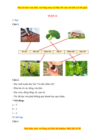 Câu 1. Nối chữ với hình: lát sàn nhà sàn lượm lúa súp lơ chùm khế ướp chè Câu 2. Đọc CẢ NHÀ CHĂM CHỈ