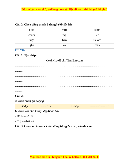 Câu 2. Ghép tiếng thành 5 từ ngữ rồi viết lại: giúp chím luộm chúm mẹ lan ướp bàn thuộm ghế cá man III. Viết Câu 1. Tập chép: