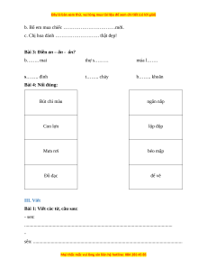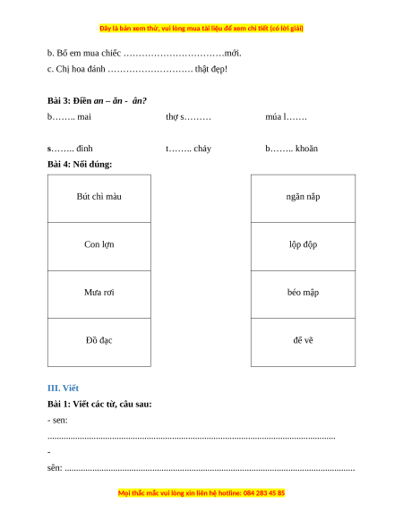 Bài 3: Điền an – ăn - ân? b…….. mai thợ s……… múa l……. s…….. đình t…….. chảy b…….. khoăn Bài 4: Nối đúng: Bút chì màu ngăn nắp Con lợn lộp độp Mưa rơi béo mập Đồ đạc để vẽ III. Viết