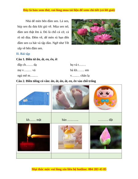 Câu 1. Điền từ ăn, ât, en, ên, êt đắp ch….… dạ họ và t….… mẹ v…..… vả bà kh……. em ngủ mê m…..… v…..… chân lạ
