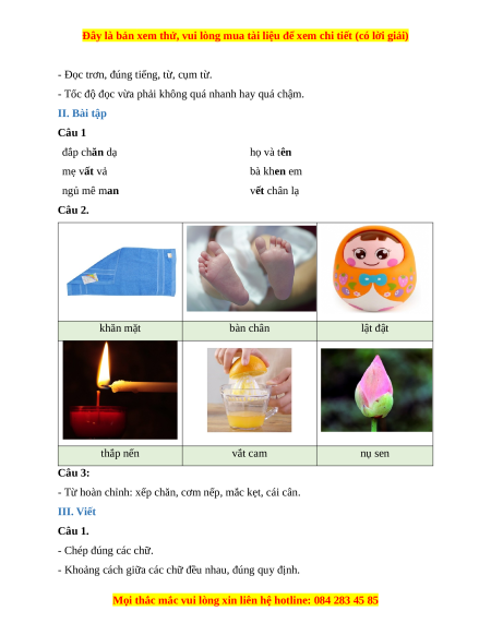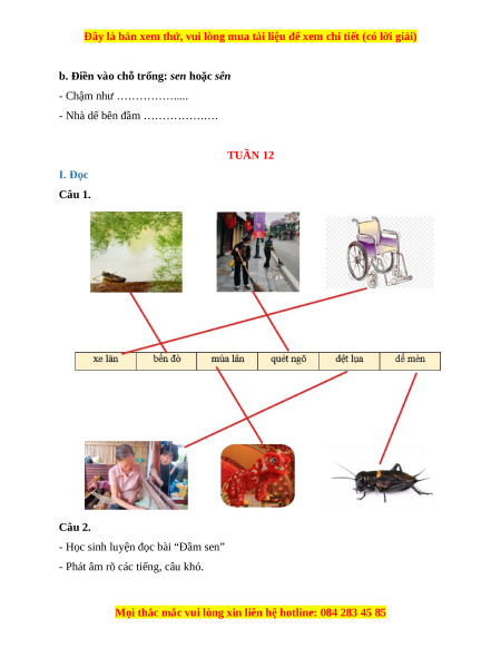 Câu 1. Nối ô chữ với hình xe lăn bến đò múa lân quét ngõ dệt lụa dế mèn Câu 2. Đọc ĐẦM SEN